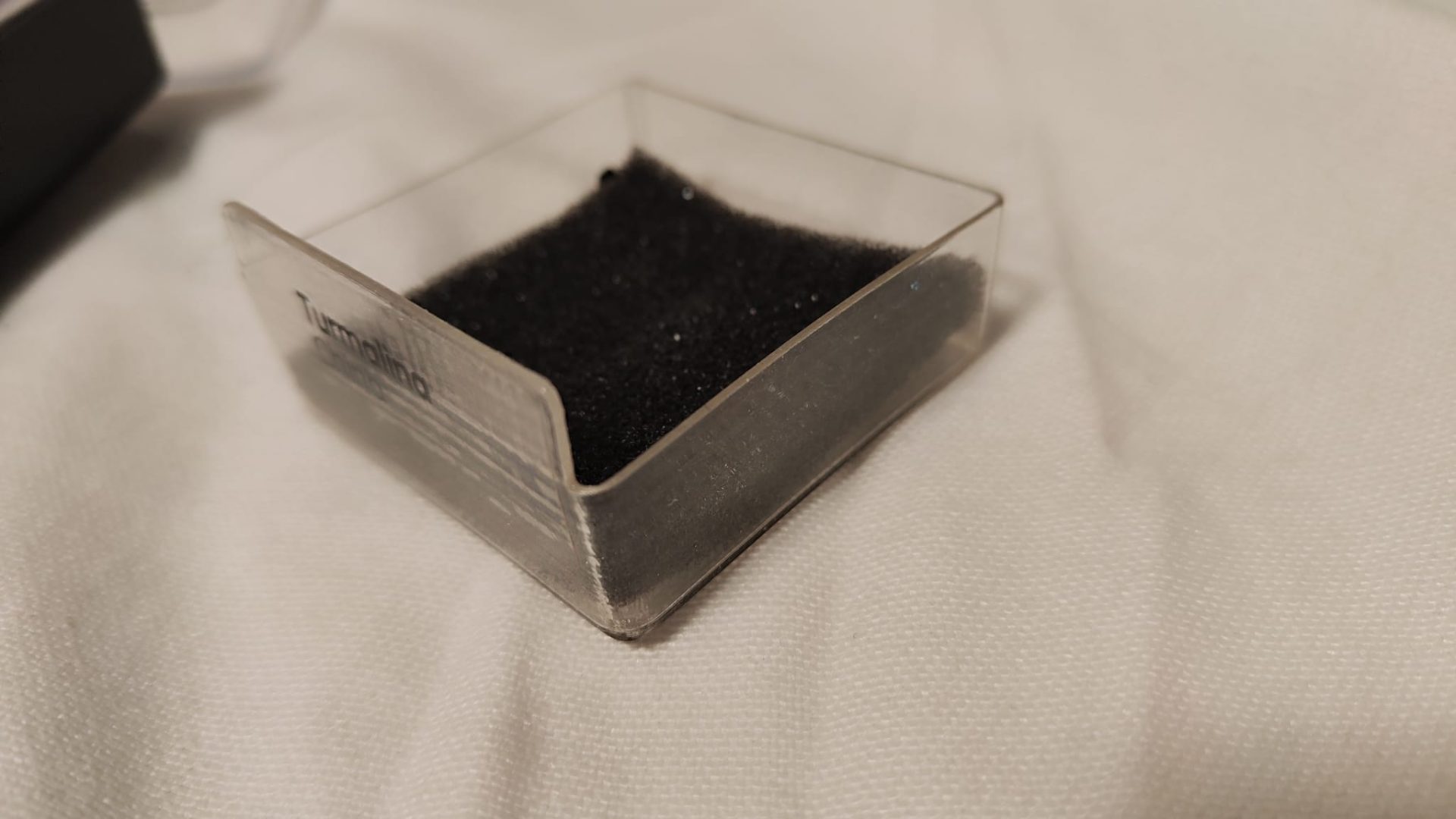 Está impresa con filamento transparente y se le ha aplicado un baño de alcohol para mejorar la claridad. Incluye una pequeña solapa frontal destinada a colocar una pegatina con el nombre del mineral.