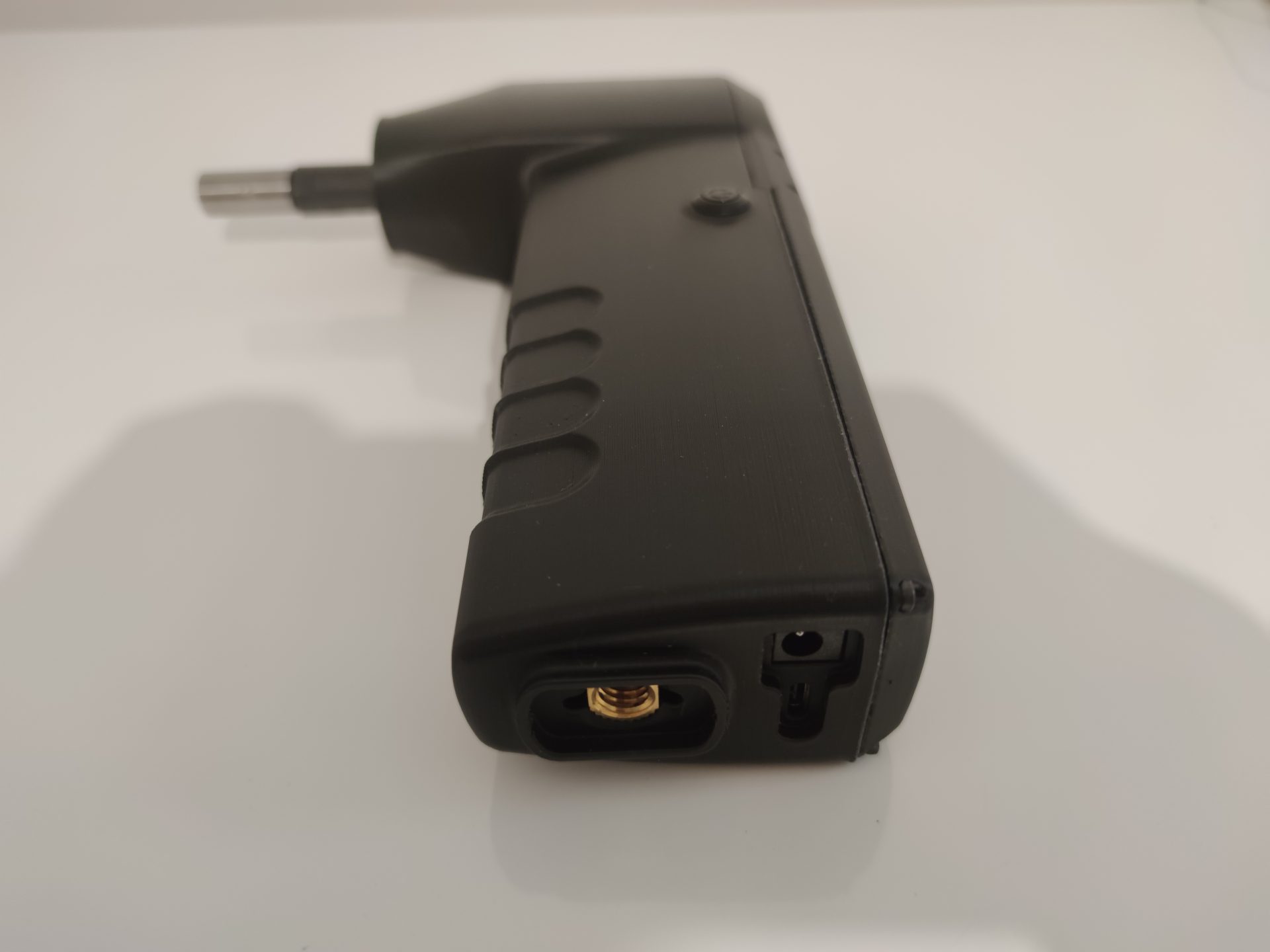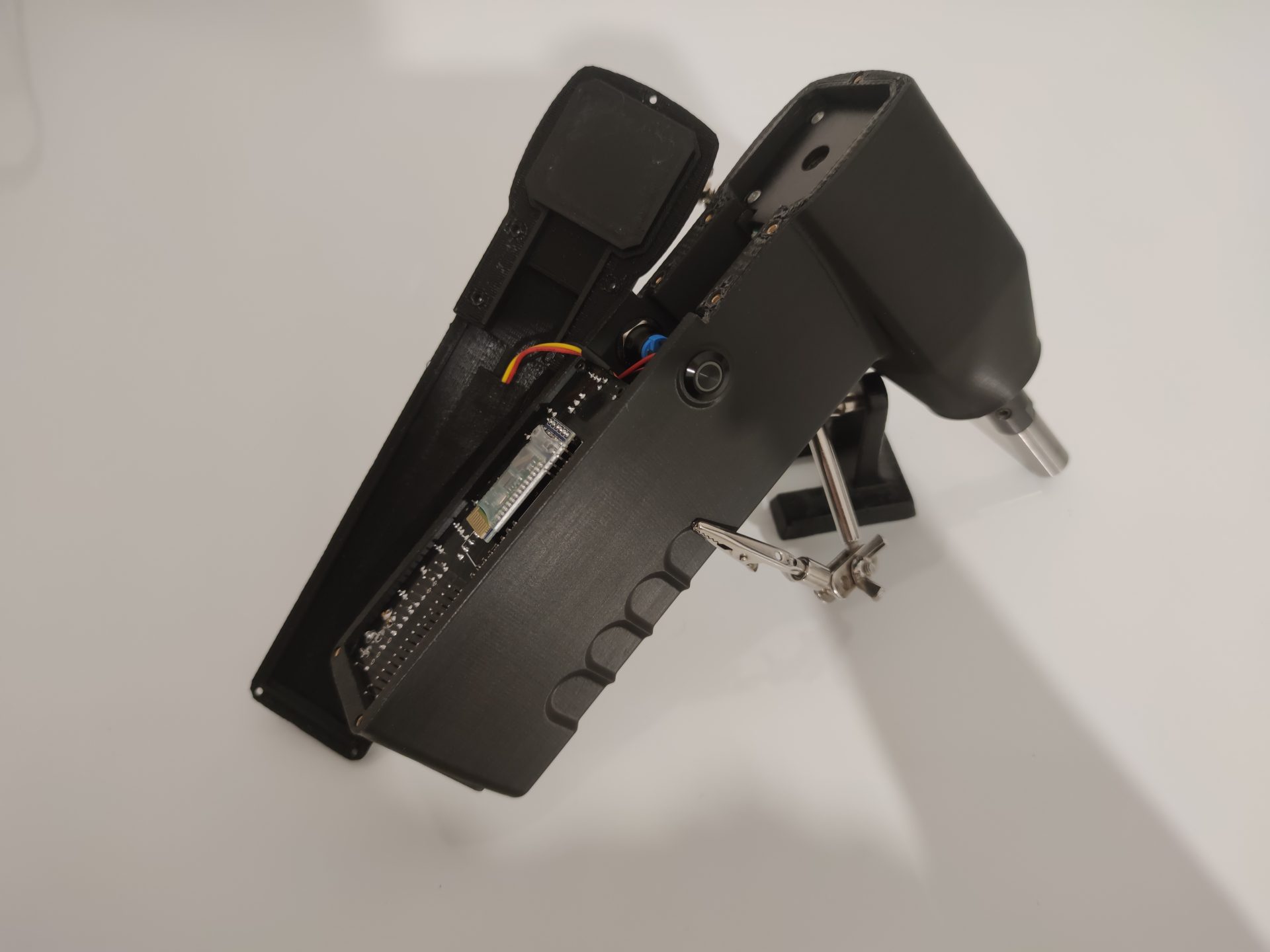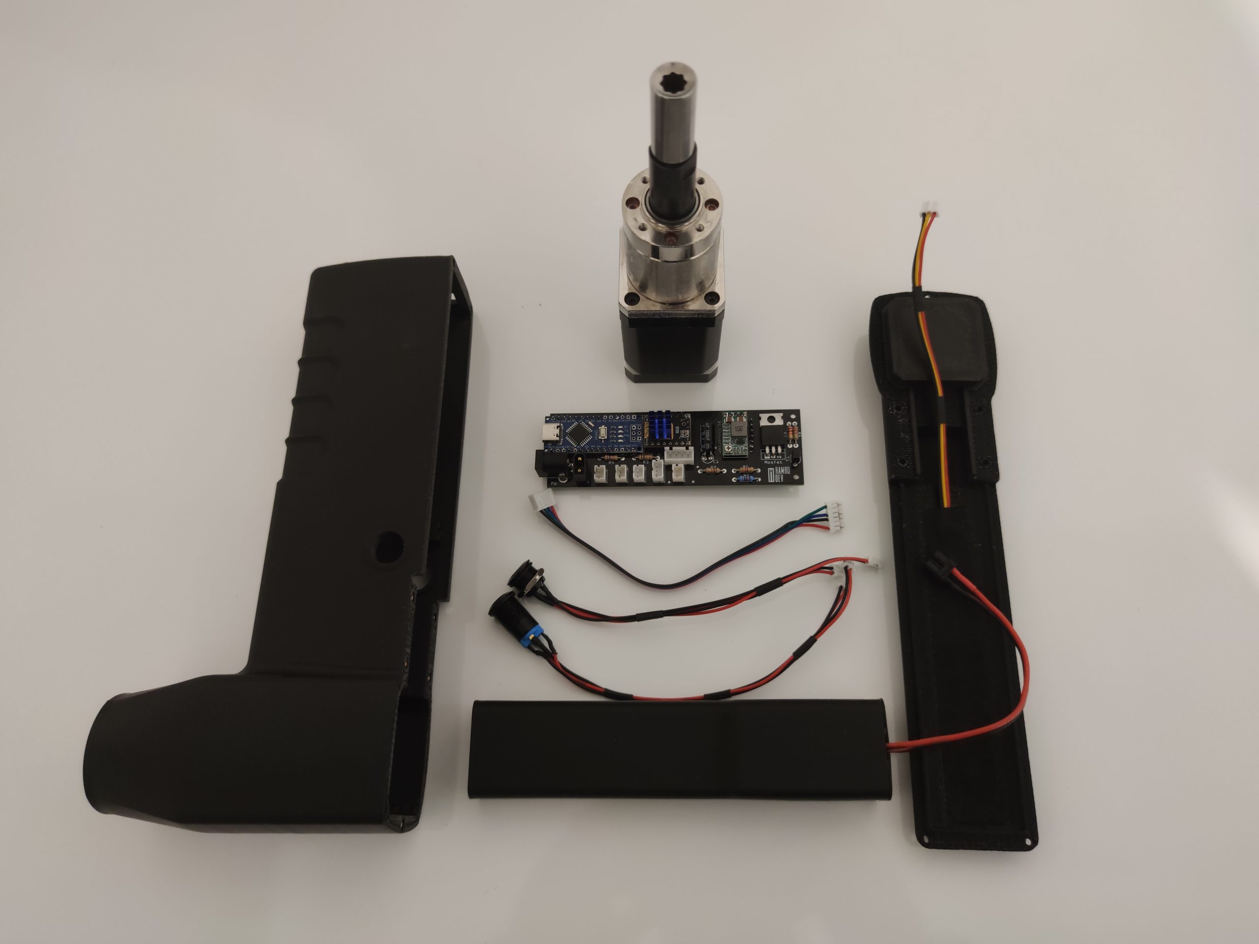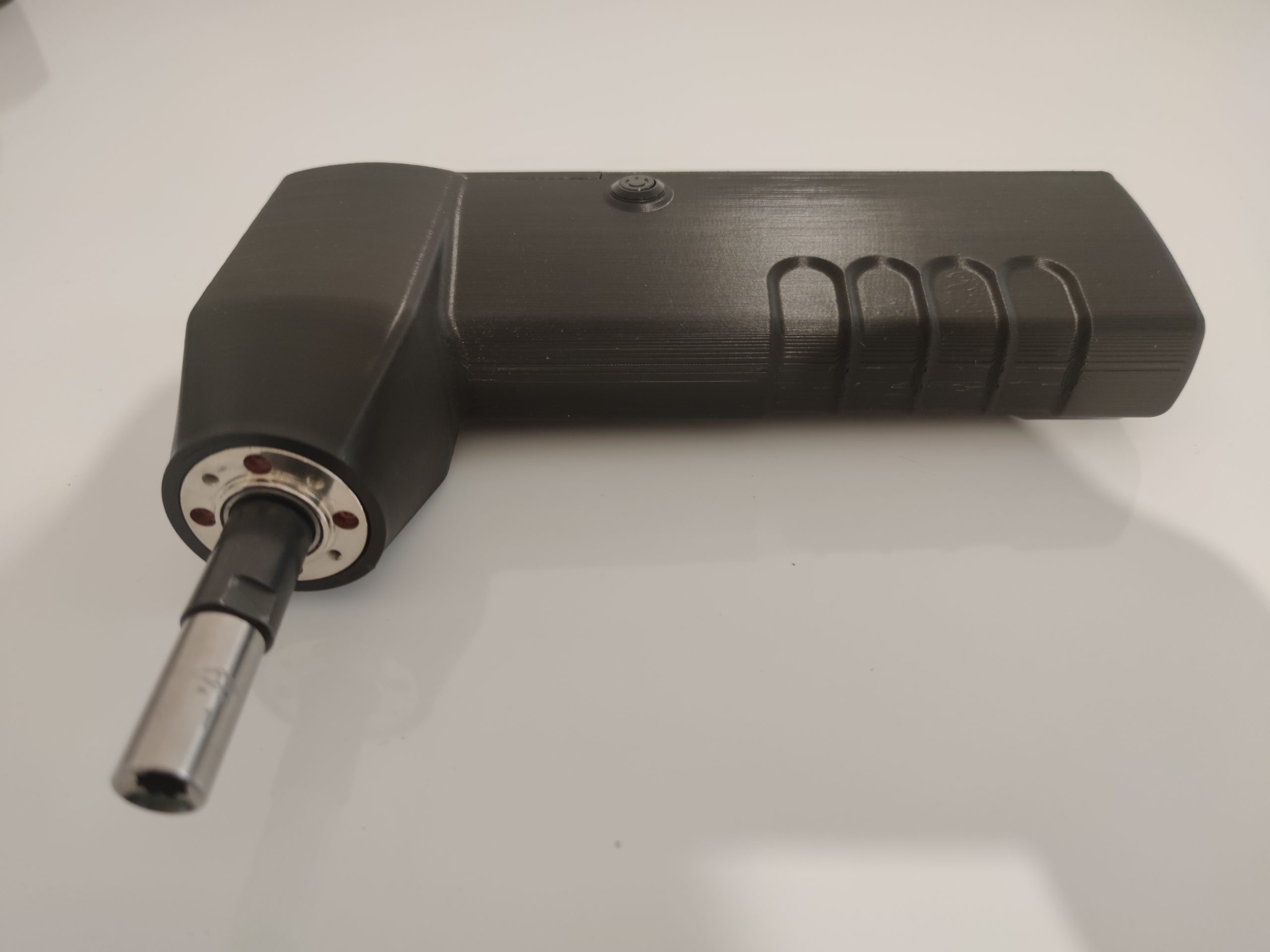 La carcasa se ha rediseñado, manteniendo un perfil más sencillo pero incorporando nuevas funcionalidades como un sensor táctil que permite que el motor solo gire mientras se sostiene la herramienta, deteniéndose al soltarla; un anclaje trasero para un brazo articulado con dos articulaciones tipo rótula y accesorios con distintos apoyos de goma (planos y esféricos) para fijar la herramienta sobre el clavijero; un circuito actualizado con driver TMC2130, más silencioso, potente y controlado vía SPI; y un sistema de batería totalmente a medida, con una carcasa diseñada para ajustarse a las celdas y al BMS.