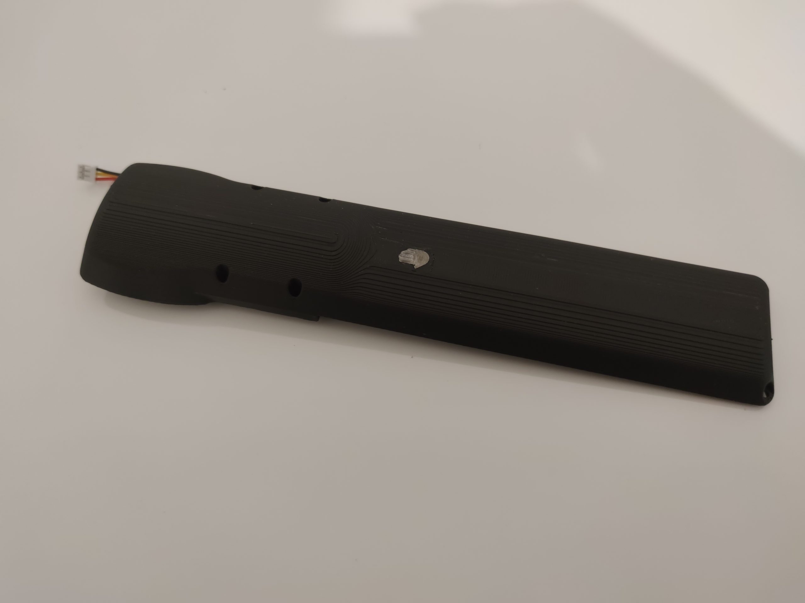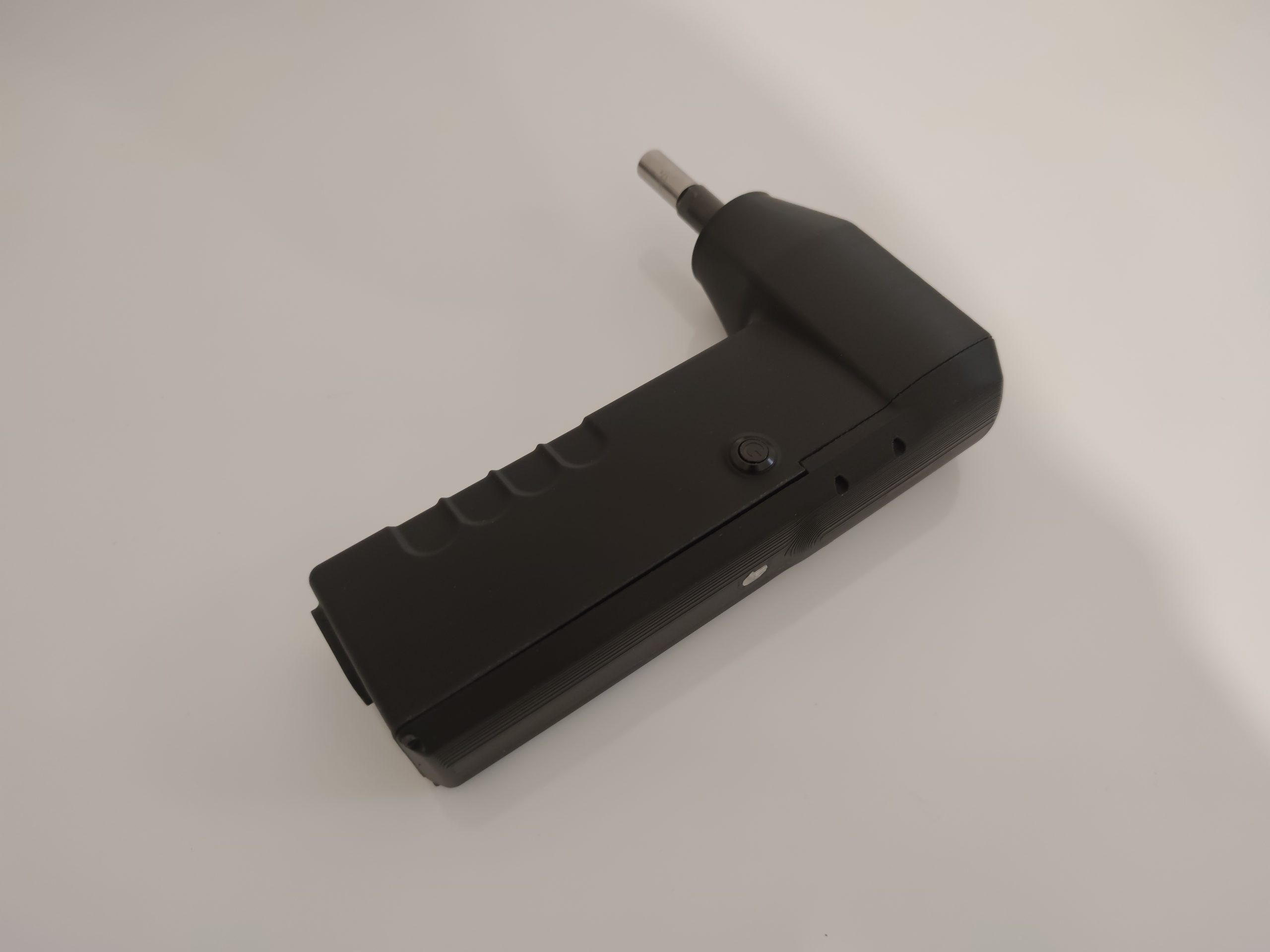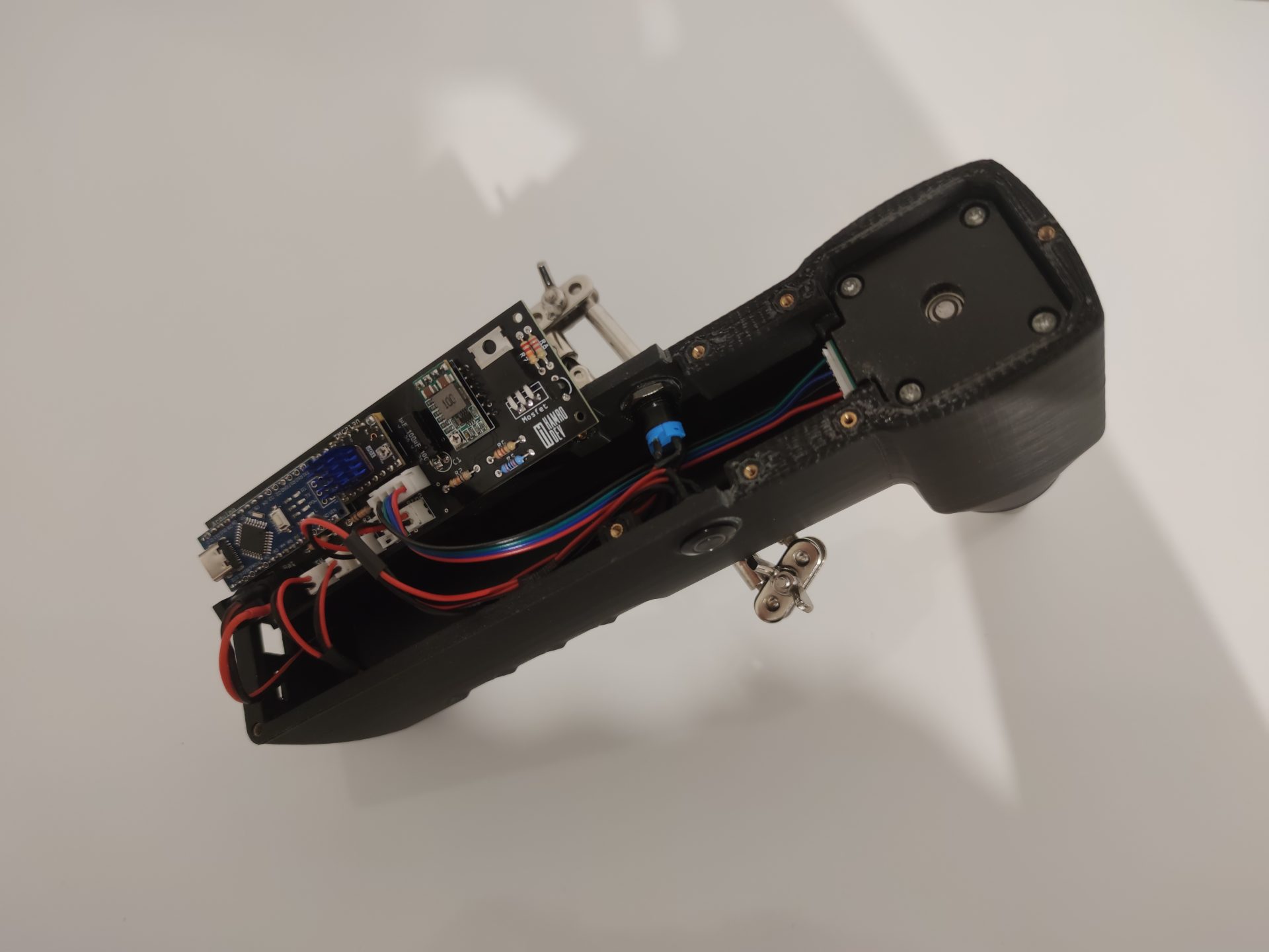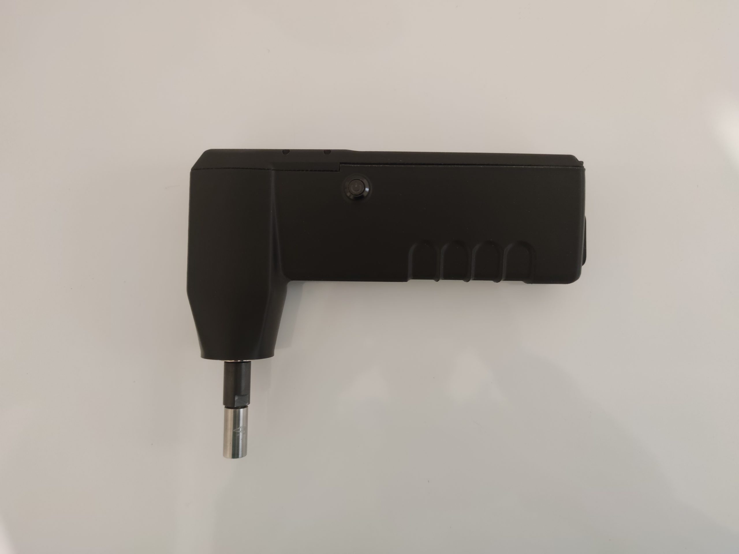 La carcasa se ha rediseñado, manteniendo un perfil más sencillo pero incorporando nuevas funcionalidades como un sensor táctil que permite que el motor solo gire mientras se sostiene la herramienta, deteniéndose al soltarla; un anclaje trasero para un brazo articulado con dos articulaciones tipo rótula y accesorios con distintos apoyos de goma (planos y esféricos) para fijar la herramienta sobre el clavijero; un circuito actualizado con driver TMC2130, más silencioso, potente y controlado vía SPI; y un sistema de batería totalmente a medida, con una carcasa diseñada para ajustarse a las celdas y al BMS.