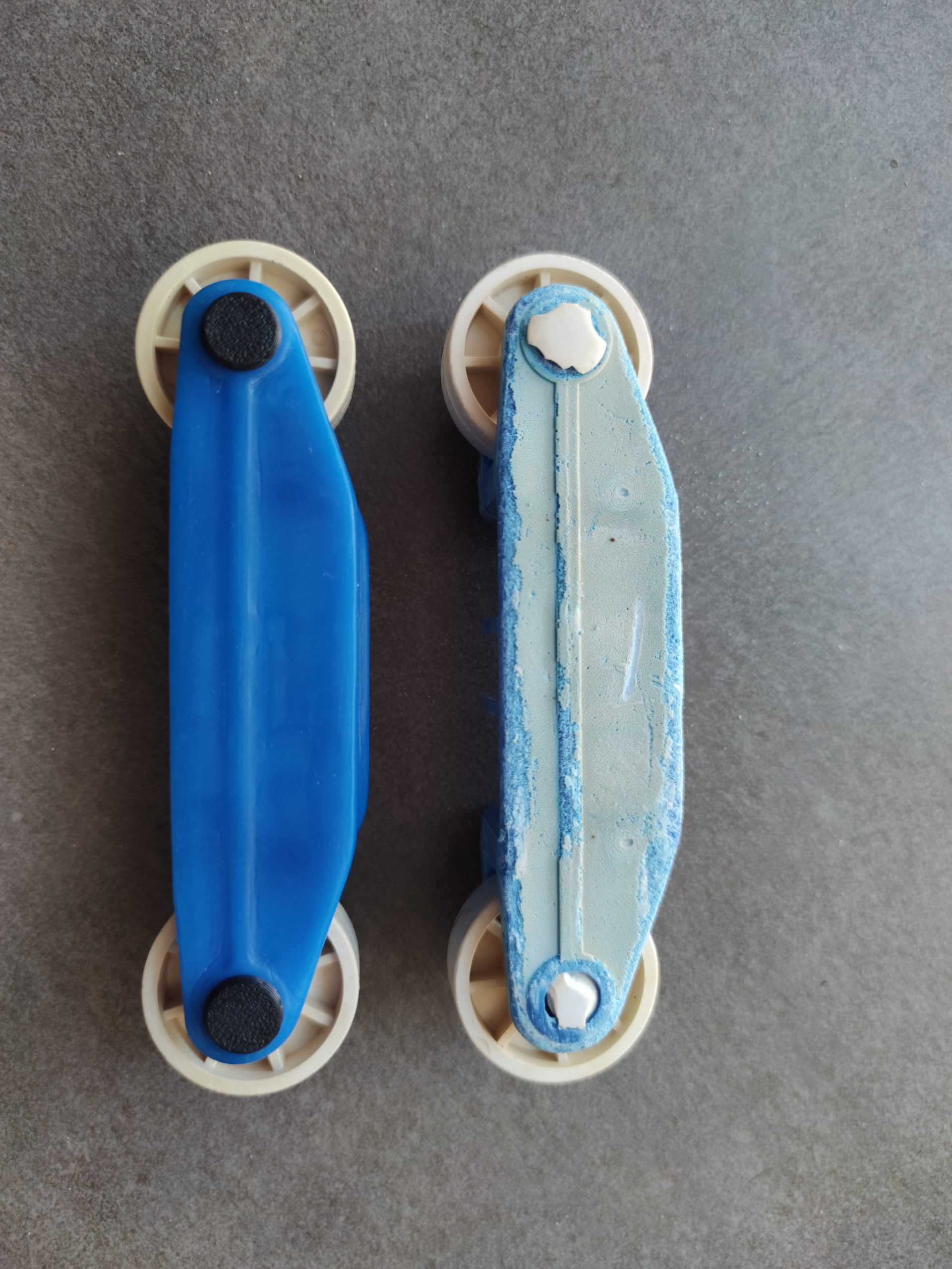 Los laterales, que soportan las ruedas y el cepillo, también se diseñan para reemplazo, pero finalmente se aprovechan las piezas existentes tras una reparación: se lijan completamente y se aplica un tratamiento especial para plásticos expuestos al sol, devolviendo resistencia y durabilidad. Esta combinación de impresión 3D y restauración permite recuperar el limpiafondos sin necesidad de sustituir toda la estructura, prolongando su vida útil.